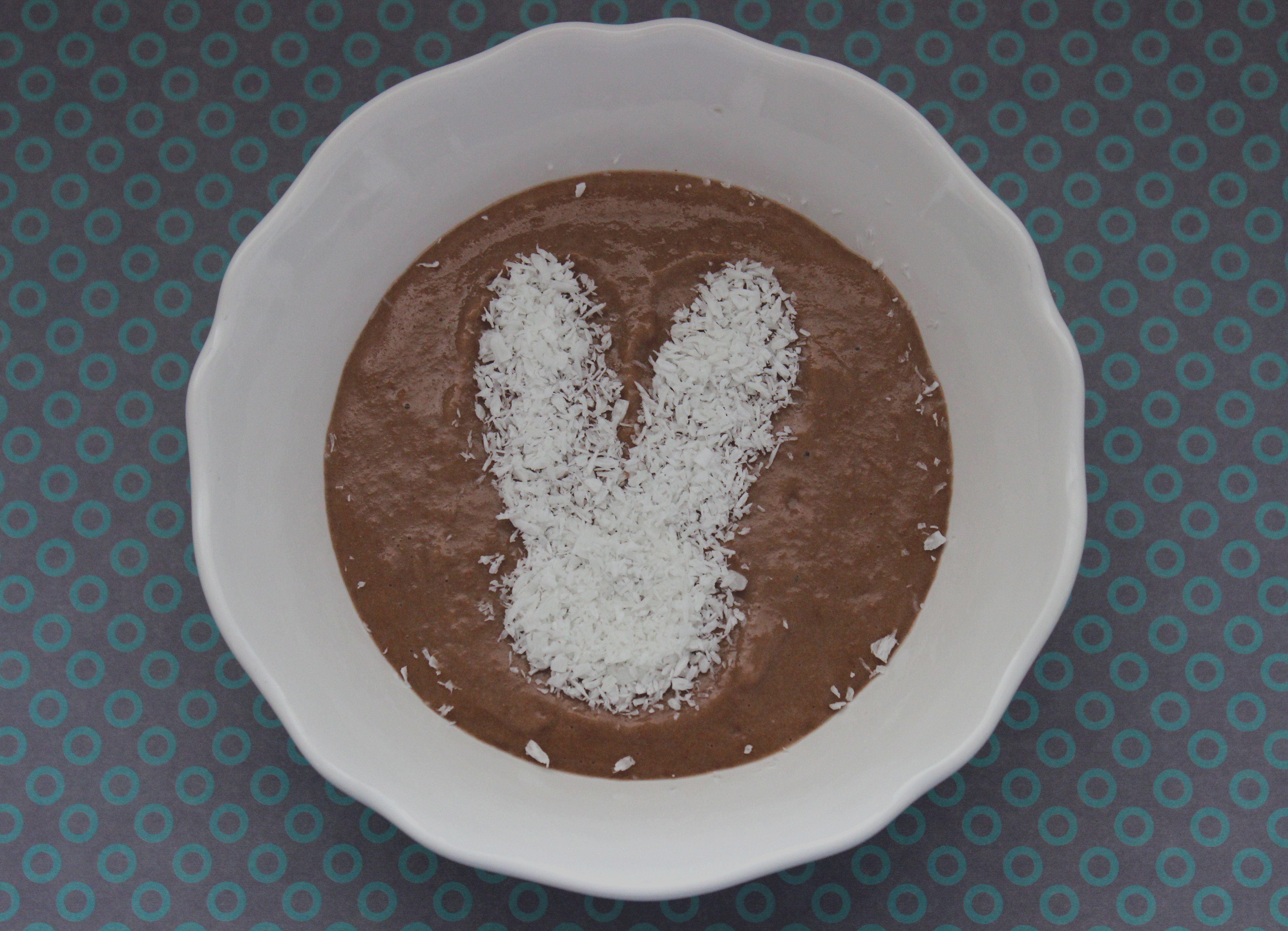 Oblíbený (nejen) velikonoční tvar na kaši „nakreslíte“ tak, že těsně nad hladinu přiložíte vykrajovátko na perníčky a vsypete do něj opatrně lžičkou kokos.