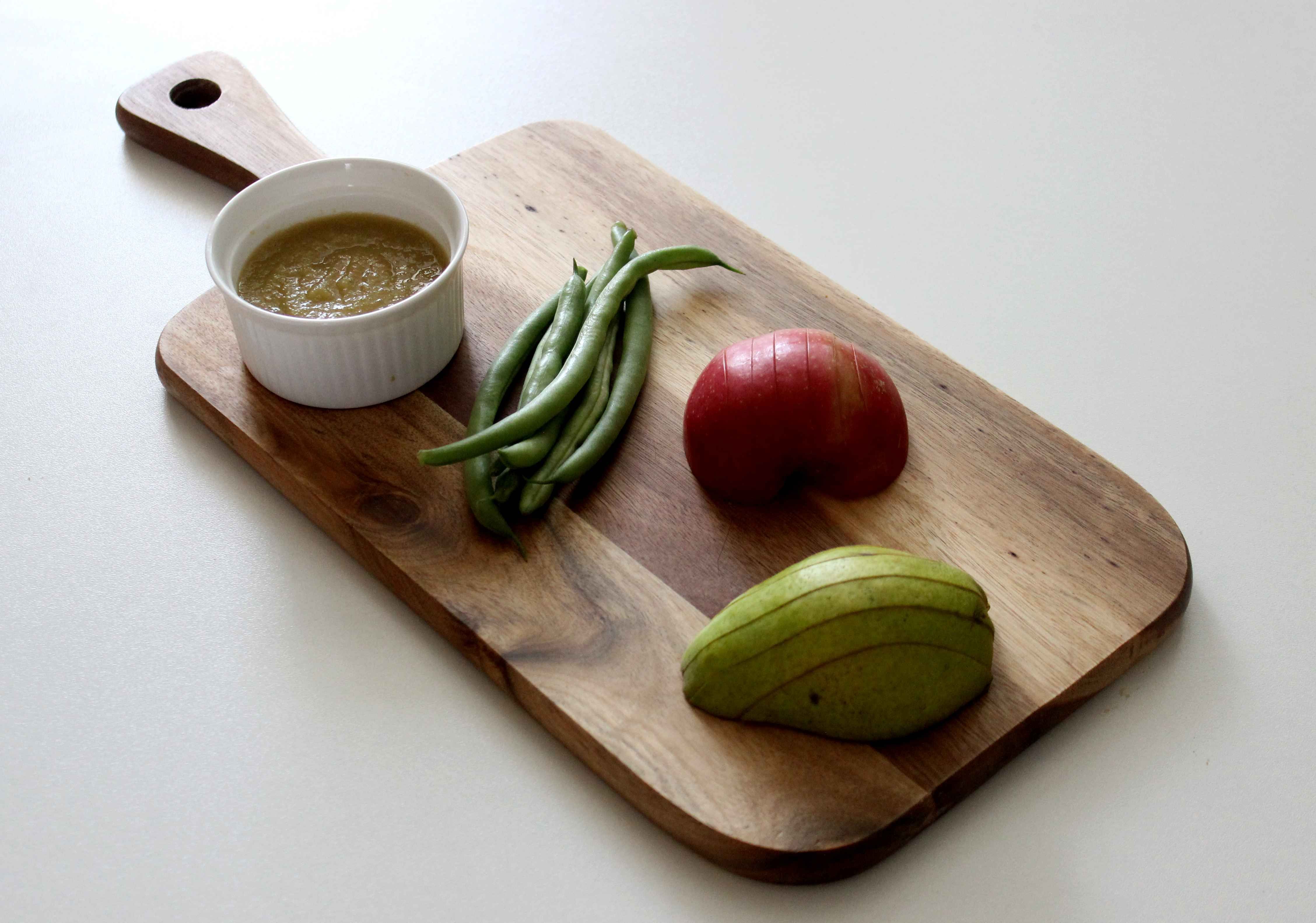 Fazolky důkladně očistíme a uštípneme jim špičky. Ovoce oloupeme, omyjeme a zbavíme jádřince. Všechny ingredience nakrájíme na kousky, vložíme do vroucí vody a vaříme do měkka. Jakmile mají kousky měkkou konzistenci, vše slijeme, vložíme do mixéru a umixujeme na jemné pyré.